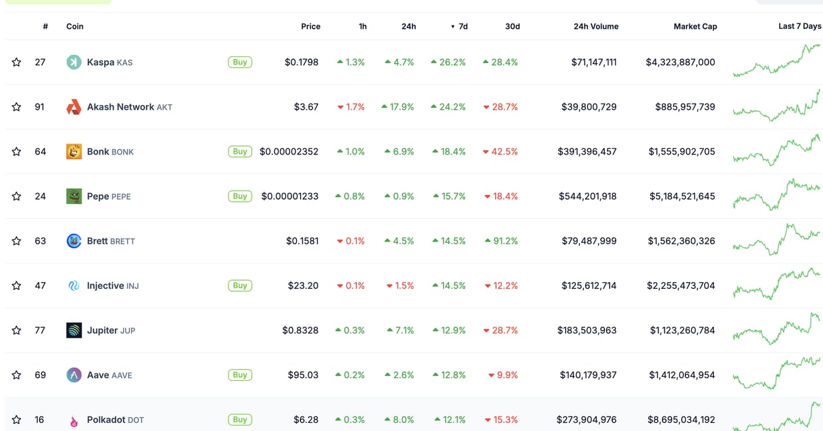 然而,这一下跌掩盖了 Kaspa 区块链的 KAS 代币 26% 的涨幅。据数据来源 CoinGecko 称,该代币在市值上排名第 27 位,已突破 18 美分,接近本月初创下的 0.196 美元的历史高点。这使得 KAS 成为市值排名前 100 位的数字资产中表现最好的代币。